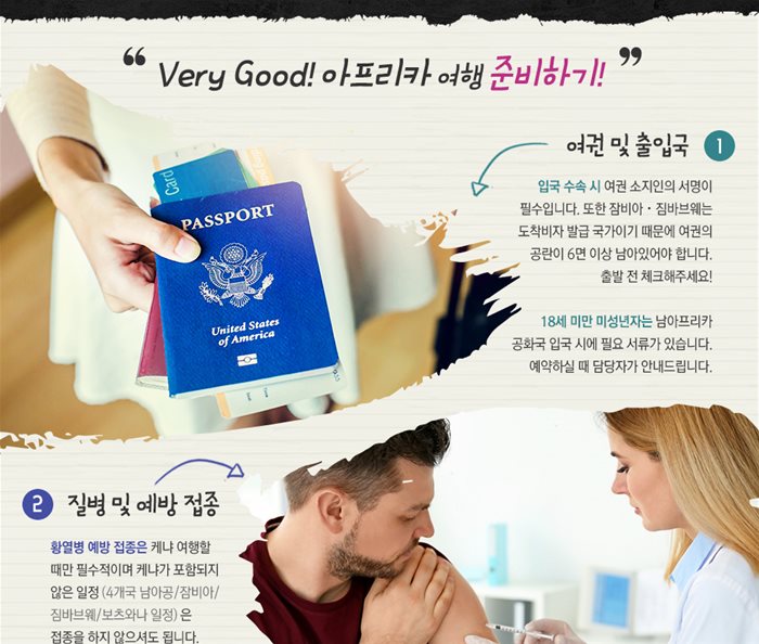 ◈ 기사/가이드경비 15명 이상 출발 시, 1인 US$80 (성인/아동 동일) 15명 미만 출발 시, 1인 US$120 - 현지에서 지불하셔야 합니다. ◈ 부득이하게 15명 미만 출발시 추가 요금 발생할수 있습니다. ◈ 도착비자비용 USD$95 ~US$125 /1인 현지에서 지불하셔야 합니다. ◈ 보츠와나 관광세 $30/1인 현지에서 지불하셔야 합니다. (2017년 6월 부터 보츠와나 방문시 의무적으로 부과) ◈ 개인적인 음료비용 , 물값, 객실 TIP, 선택관광 비용 등 ◈ 유류할증료는 매달 변동가격이 적용되므로 참고 부탁 드립니다. ◈ 선택관광안내 - 일정표 하단 참조 ◈ 예약 시 약관 및 주의사항을 반드시 참고하시기 바랍니다. ◈ 인천-홍콩 왕복 구간은 항공 예약현황에 따라 대한항공 / 캐세이시픽 등으로 출발 시각 미팅시간 / 도착시간은 오전이나 오후로 변동 될 수 있습니다. ◈18세 미만의 미성년자 동반의 경우 필요 서류 있습니다. -> 일정표 하단의 여행시 주의사항 확인부탁드립니다. |